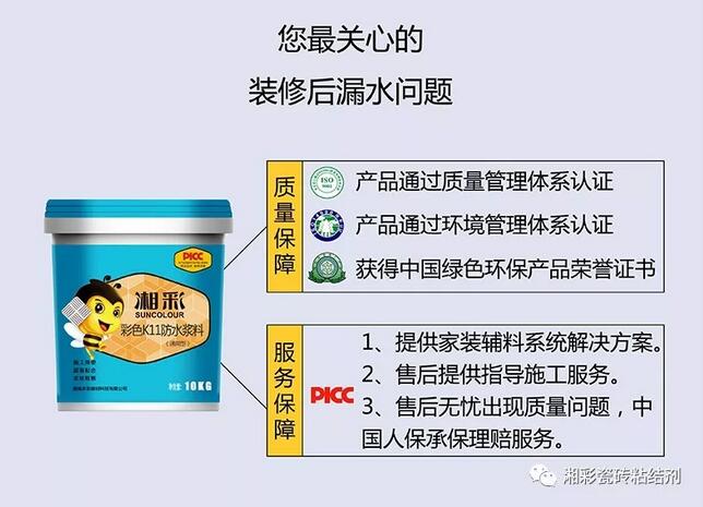 2、优异的粘结性能,可以直接在防水层上粘贴瓷片,永不空鼓、掉砖,尤其适合高层建筑内外墙以及厨卫间粘贴瓷砖部位的防水;
